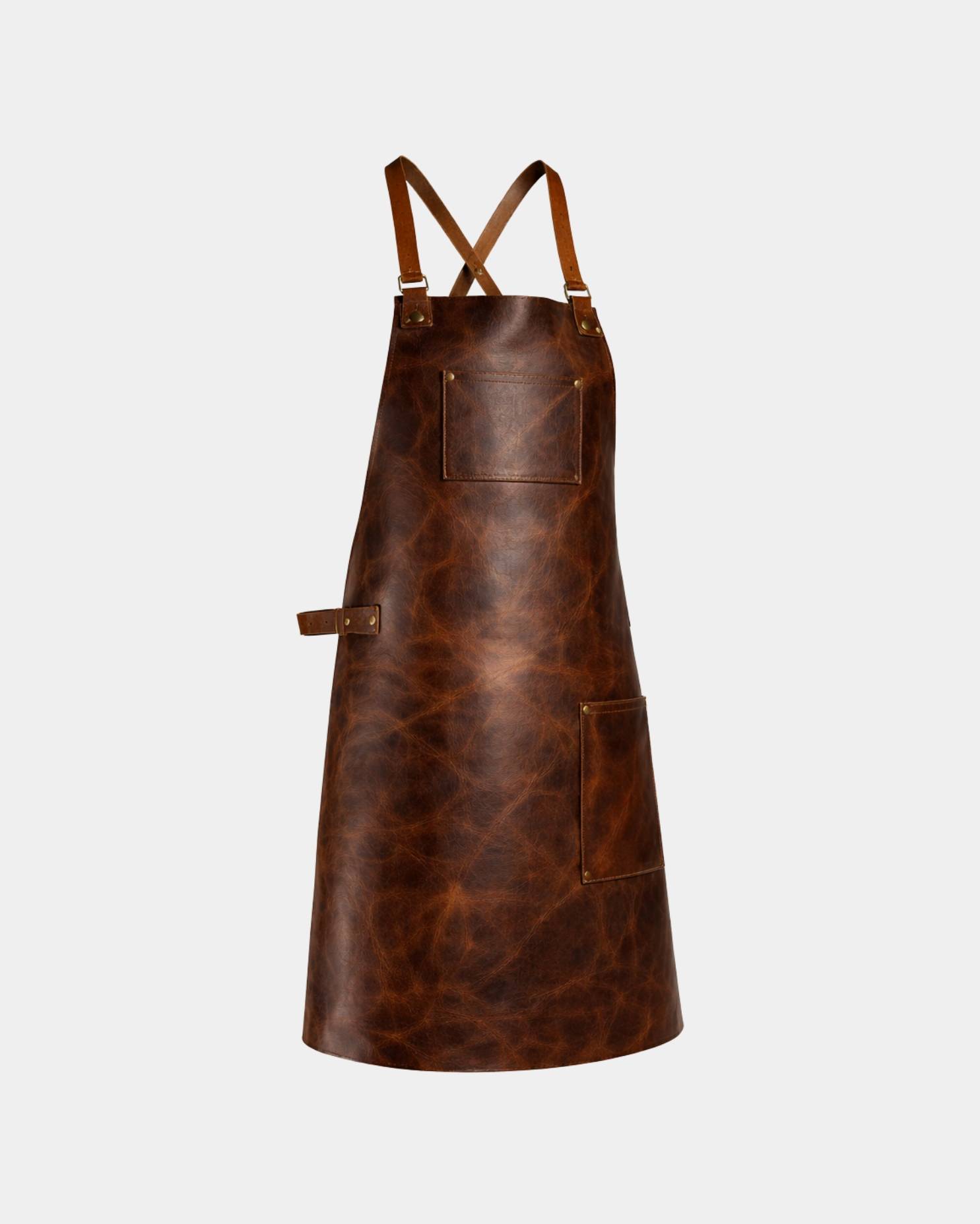 Handmade water buffalo leather apron with cross-back straps, tool pockets & rugged style. Ideal for chefs, woodworkers & welders. Ages beautifully over time.